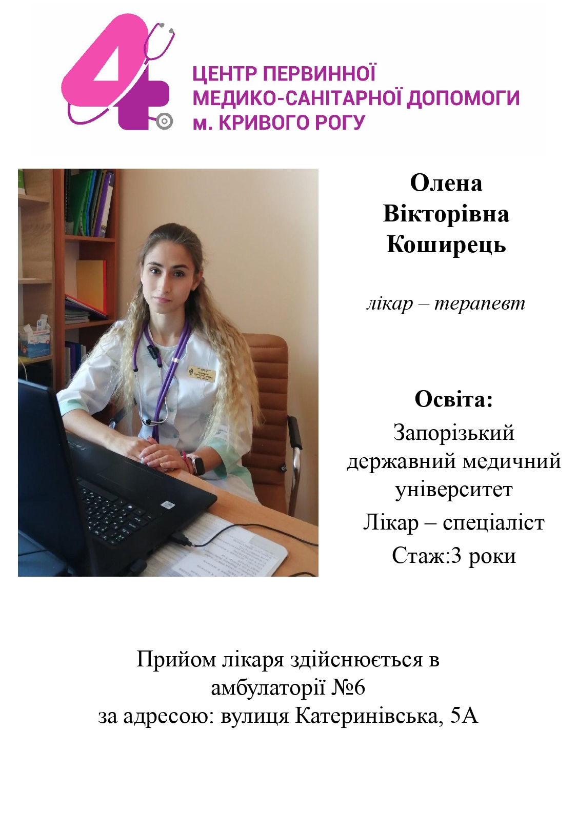 Коширець Олена ВікторівнаЛікар-терапевт